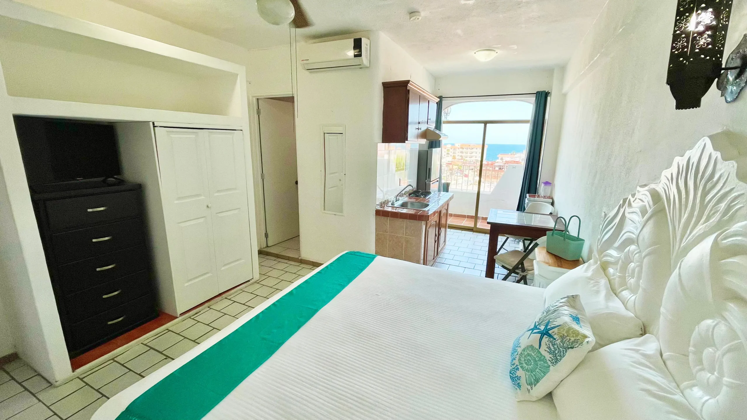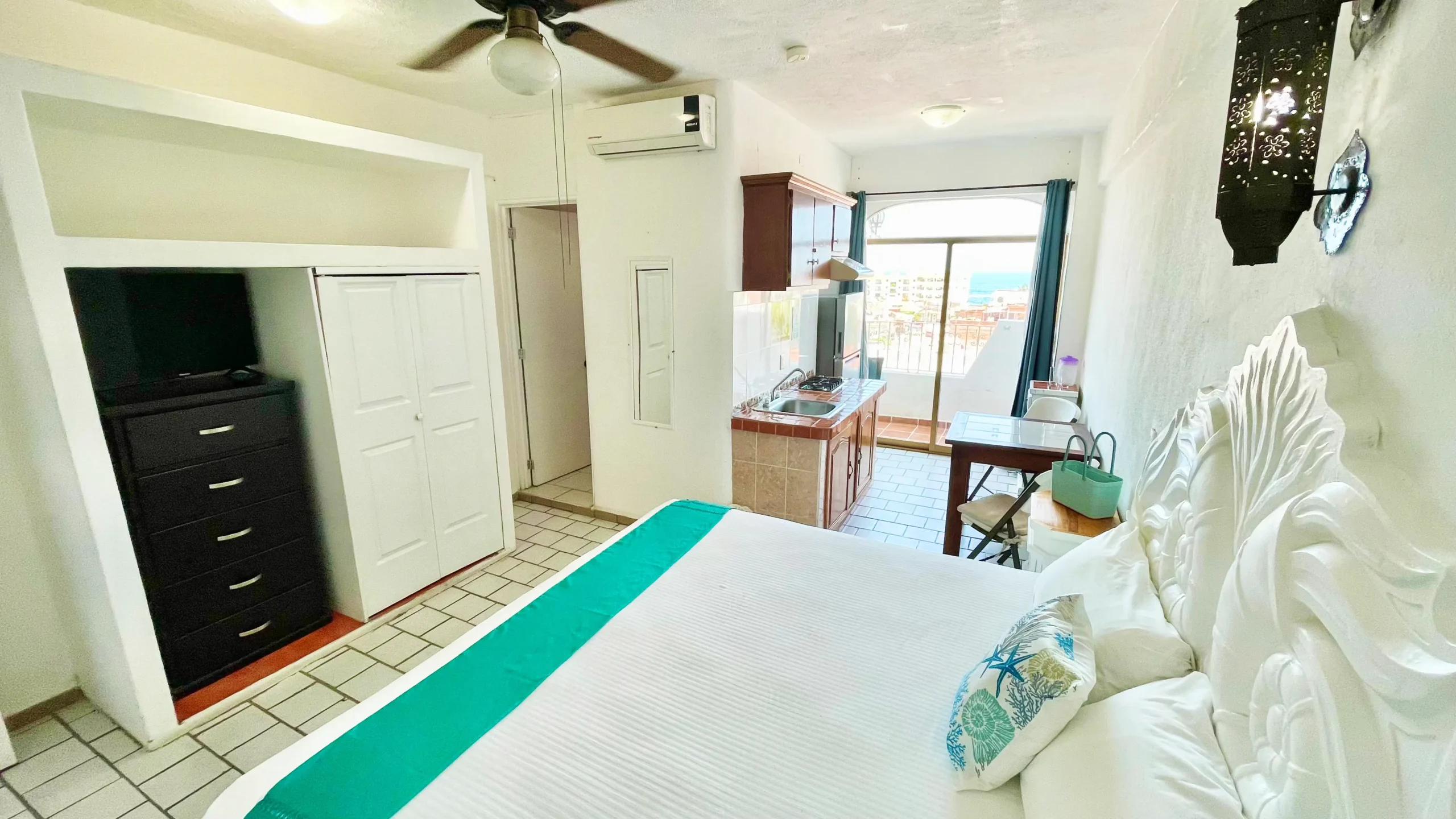 Nuestra habitación Superior Doble ofrece una experiencia cómoda y acogedora con vista al mar desde su balcón privado. Equipada con una cama King Size, Smart TV, aire acondicionado y ventilador de techo para asegurar tu confort. La habitación también cuenta con un armario espacioso, refrigerador, y mesa con 2 sillas. La decoración luminosa y los detalles artesanales crean un ambiente relajante y único para tus vacaciones.